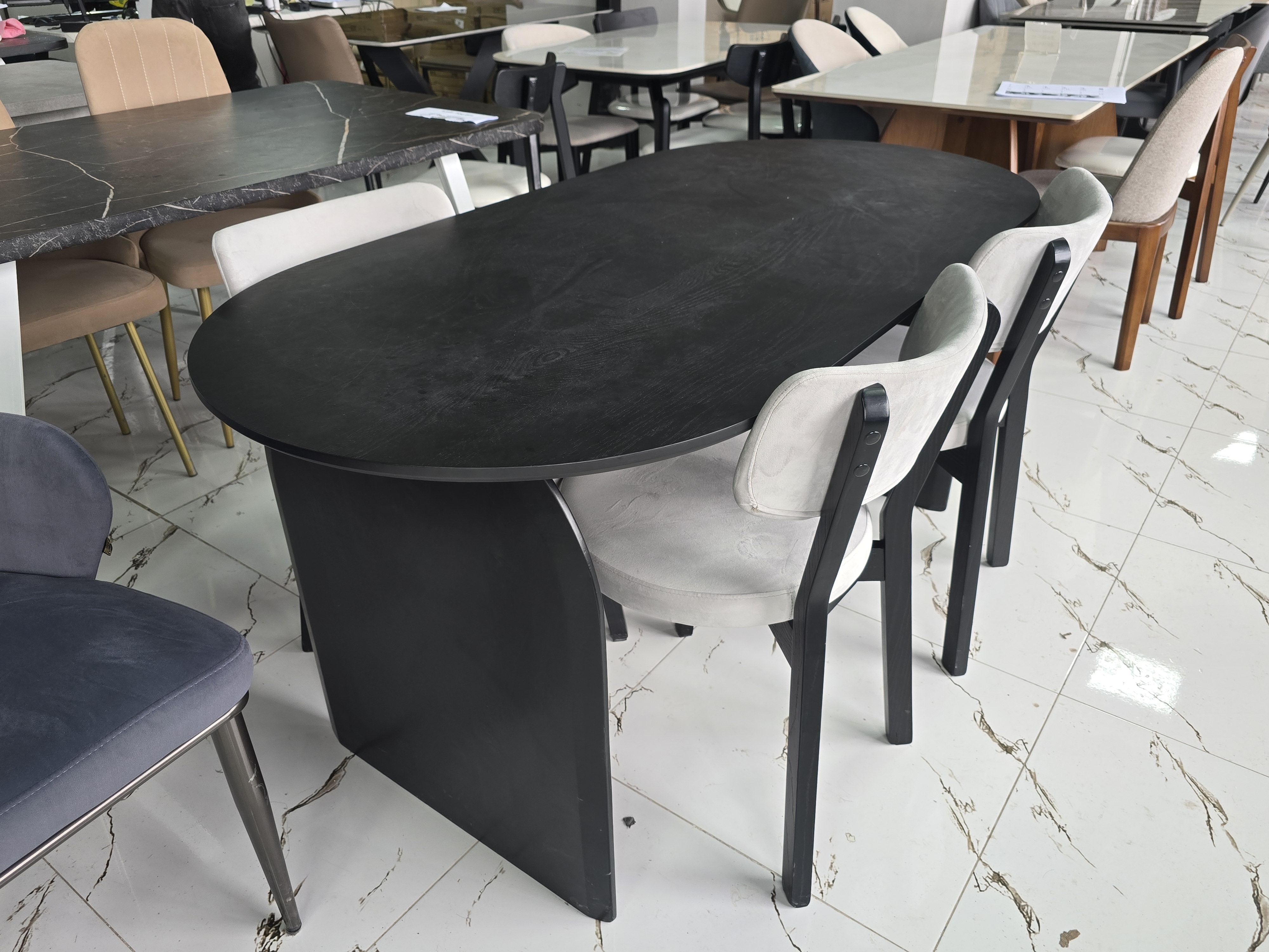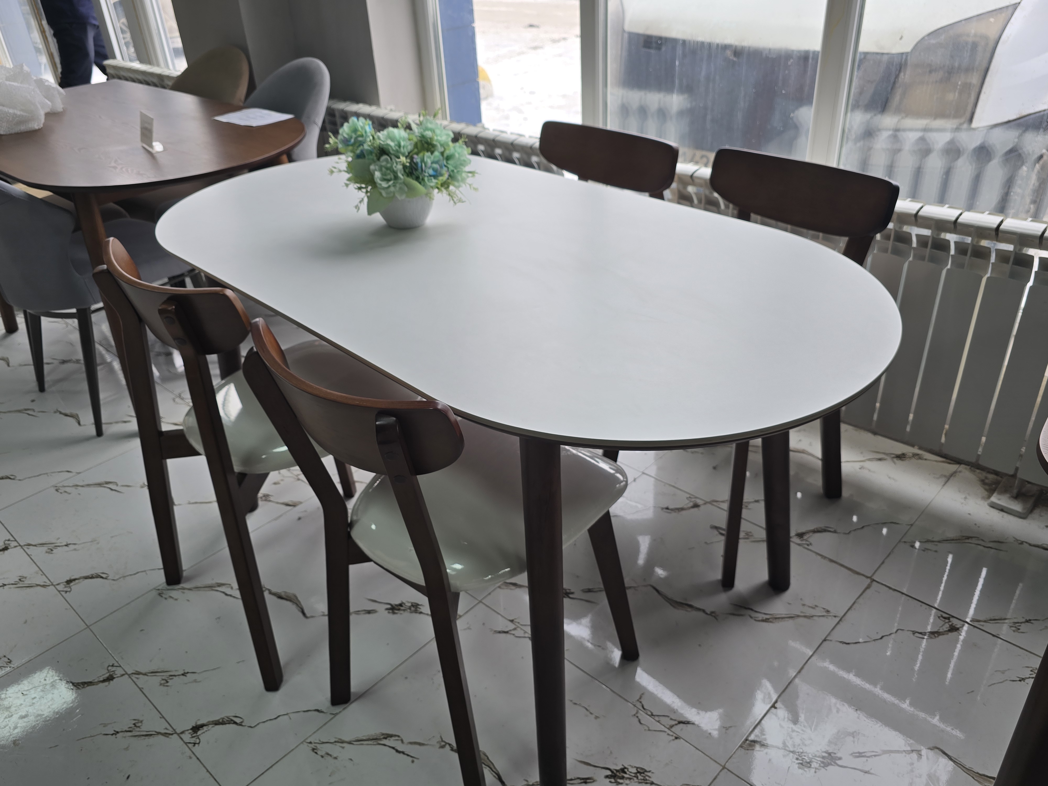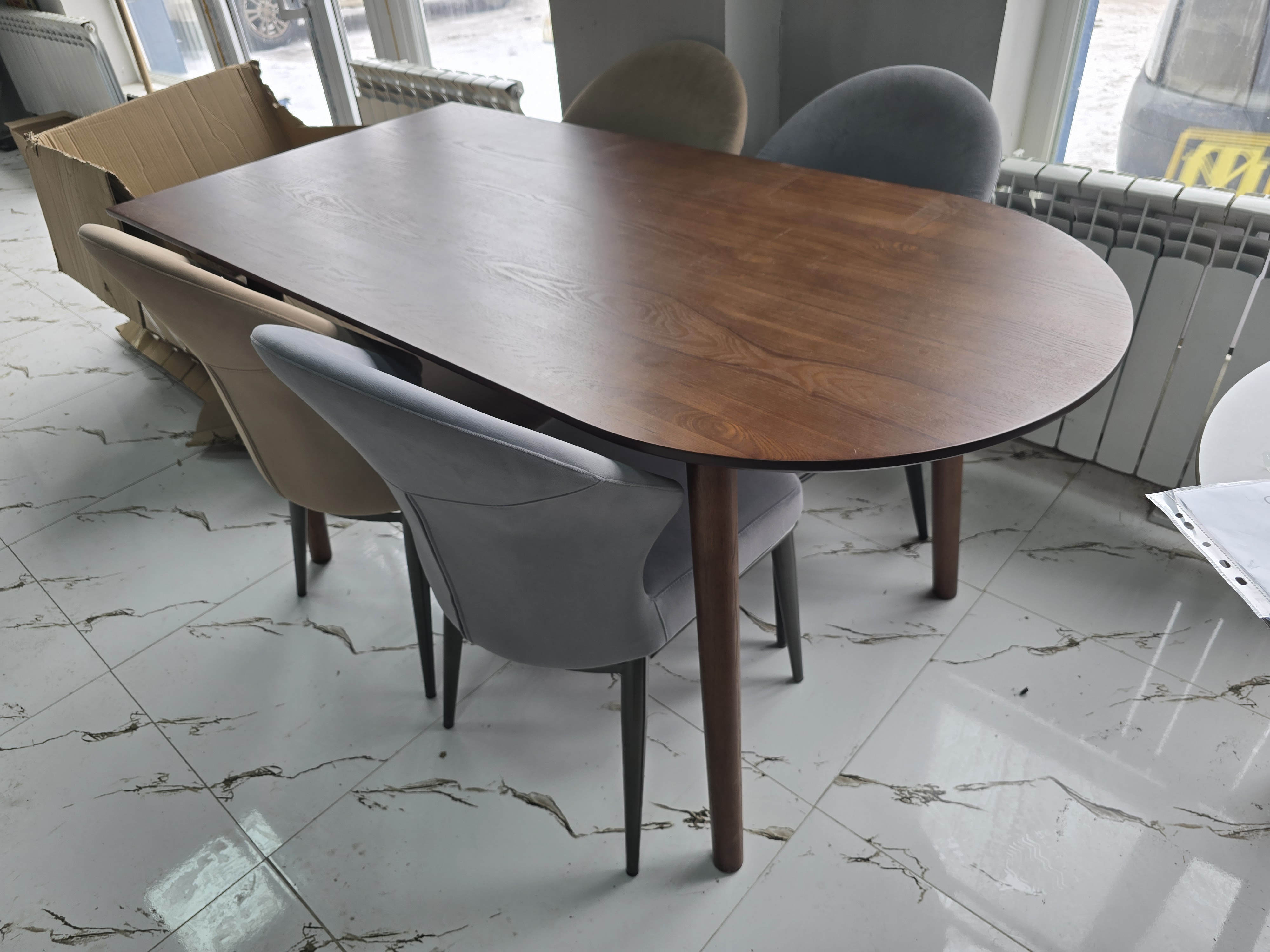 Форма стола овальный Материал стола ЛДСП, дерево Стол (ДхШхВ)160х85х75 Цвет серый, коричневый Тон однотонный Страна Казахстан